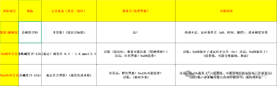 核心逻辑:总硬度 (TH) 是战果的直接体现;酚酞碱度 (P-Alk) 和总碱度 (T-Alk) 是两位“药剂审计员”,专门盯着碳酸钠和氢氧化钠有没有超额报销!